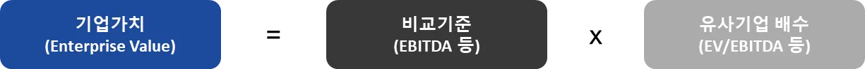 최종적으로, 평가대상 회사의 비교기준(Ex : EBITDA)에 산출된 유사기업 배수(Ex : EV/EBITA)를 곱하여 기업가치를 계산합니다.