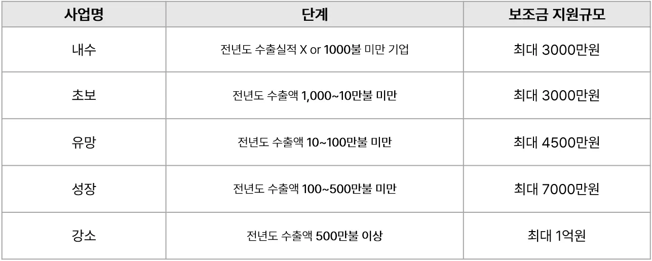신청 기업의 전년도 직접 수출액에 따라 지원 가능한 단계가 있으며, 단계별로 지원규모 상이