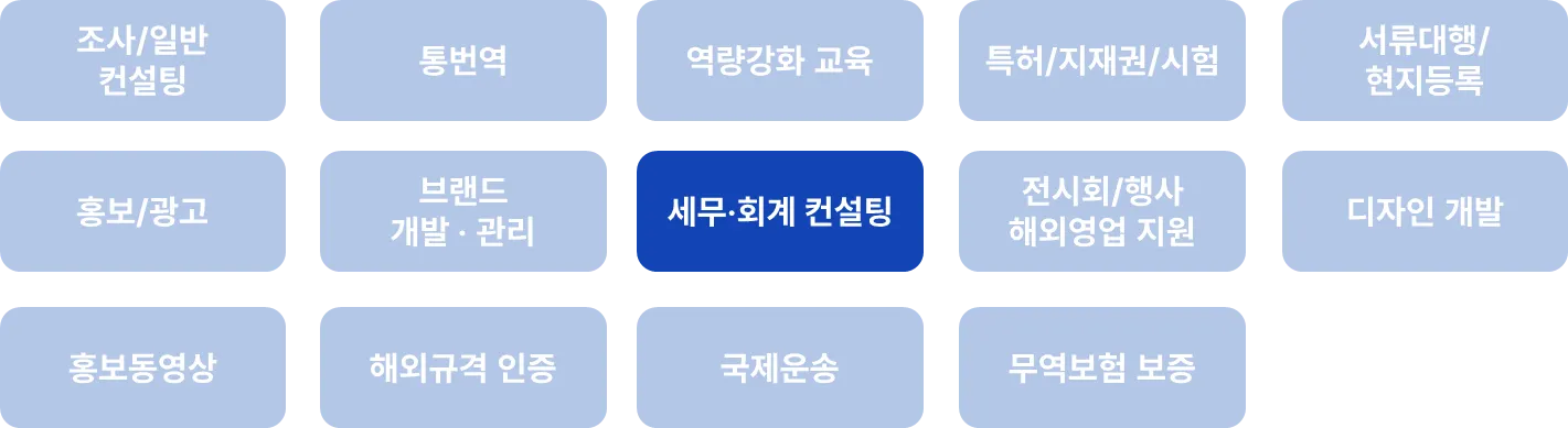 2년 연속 세무회계 컨설팅 분야 수행기관으로 등록되어 있으며 수요 기업들의 해외 진출을 위한 세무•회계 분야의 전문 컨설팅 서비스를 제공하고 있습니다.