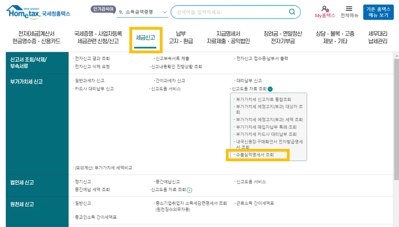 세금신고 ⇒ 부가가치세 신고 ⇒ 수출실적명세서 조회 클릭