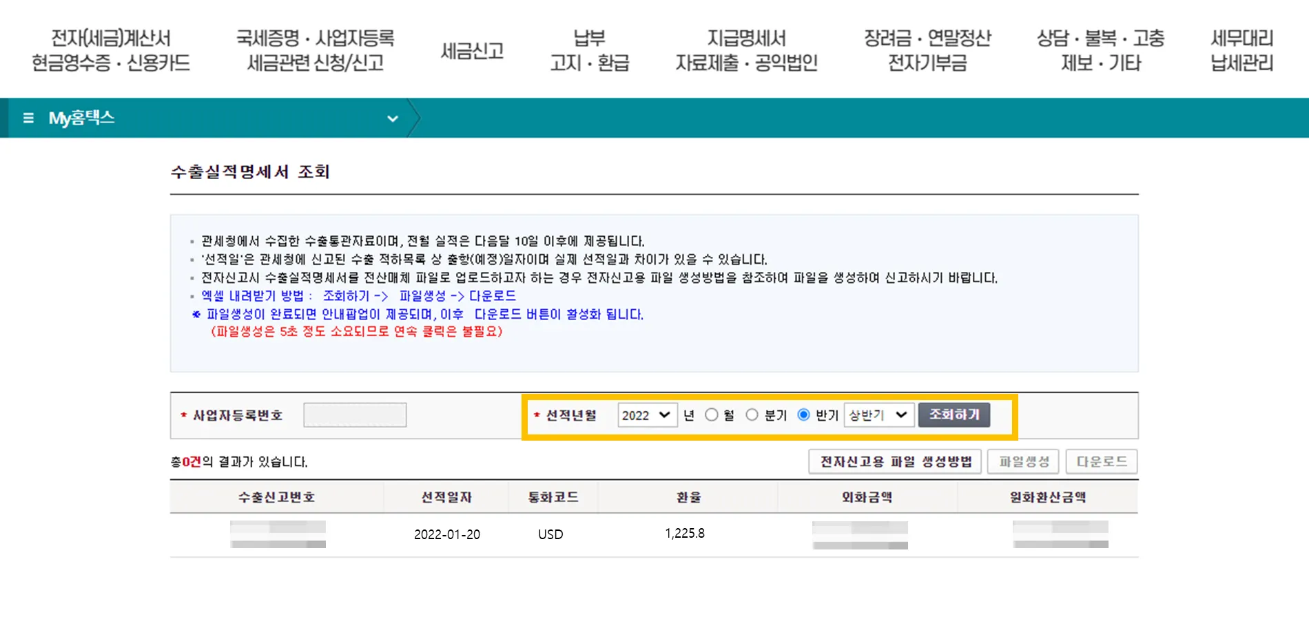 예) 2022년에 1년 동안의 수출 실적을 보려면 반기 - 상반기/하반기를 모두 조회합니다.
