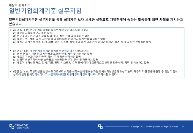 이번 사례의 고객사 또한 개발비 회계처리를 위해 감사인과 사전 커뮤니케이션을 진행하고 있으며, 감사인의 눈높이에 맞는 증빙과 근거를 제시하기 위해 크리에이티브 파트너스와 함께 준비하고 있습니다.